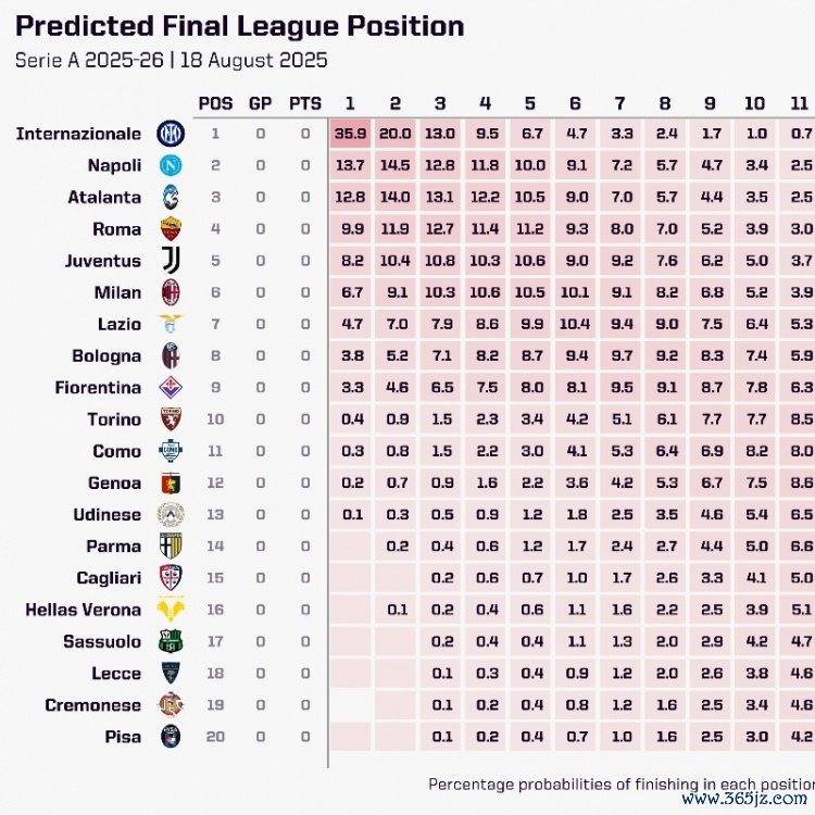 8月21日讯 opta通过超等筹办机推断本赛季意甲名次,国米有35.9%的概率夺冠,在夺冠概率上那不勒斯、亚特兰大分列二三位。