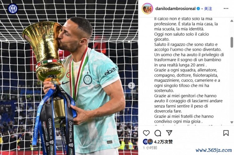 8月30日讯 本日,国米旧将丹布罗西奥在个东说念主Ins上发表长文,告示退役。