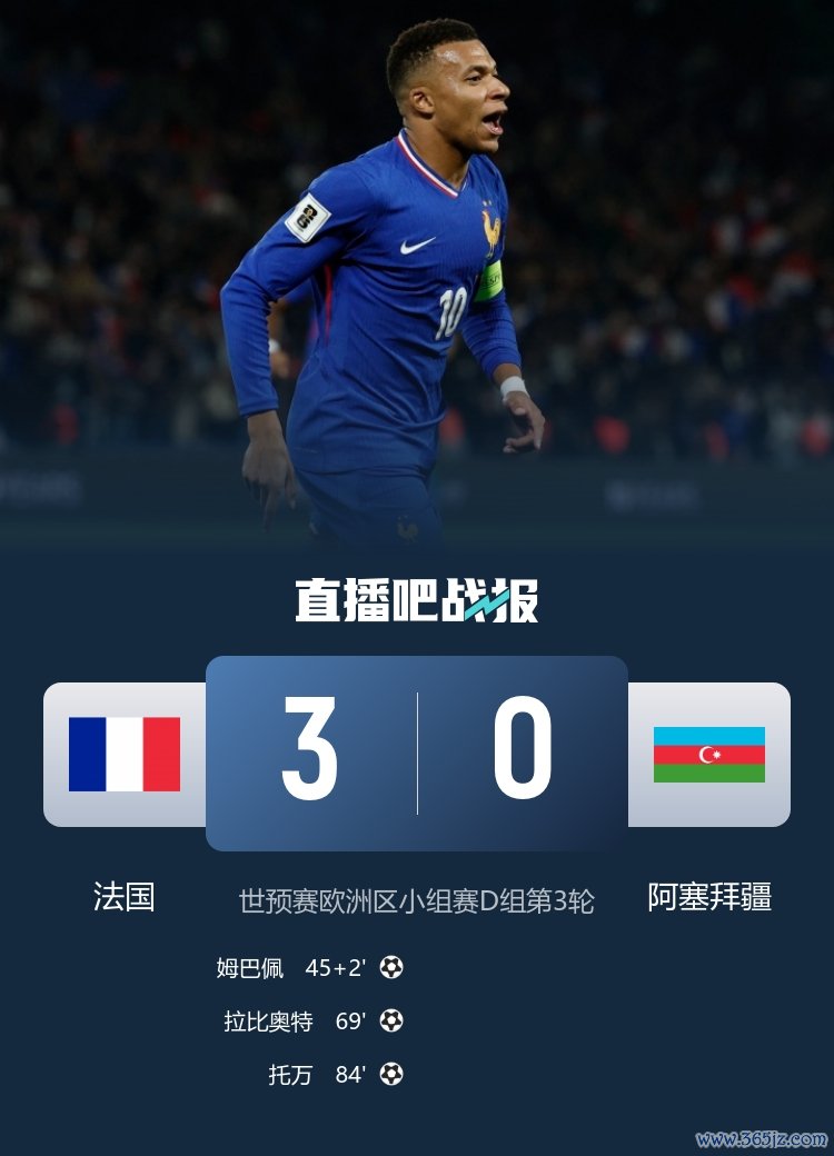 法国队3-0打败阿塞拜疆,自2022年3月25日对阵科特迪瓦以来,法国队初度在一场比赛中莫得任何又名巴黎圣日耳曼球员出场,禁止了归并46场国度队比赛中王人有巴黎球员参赛的记载。