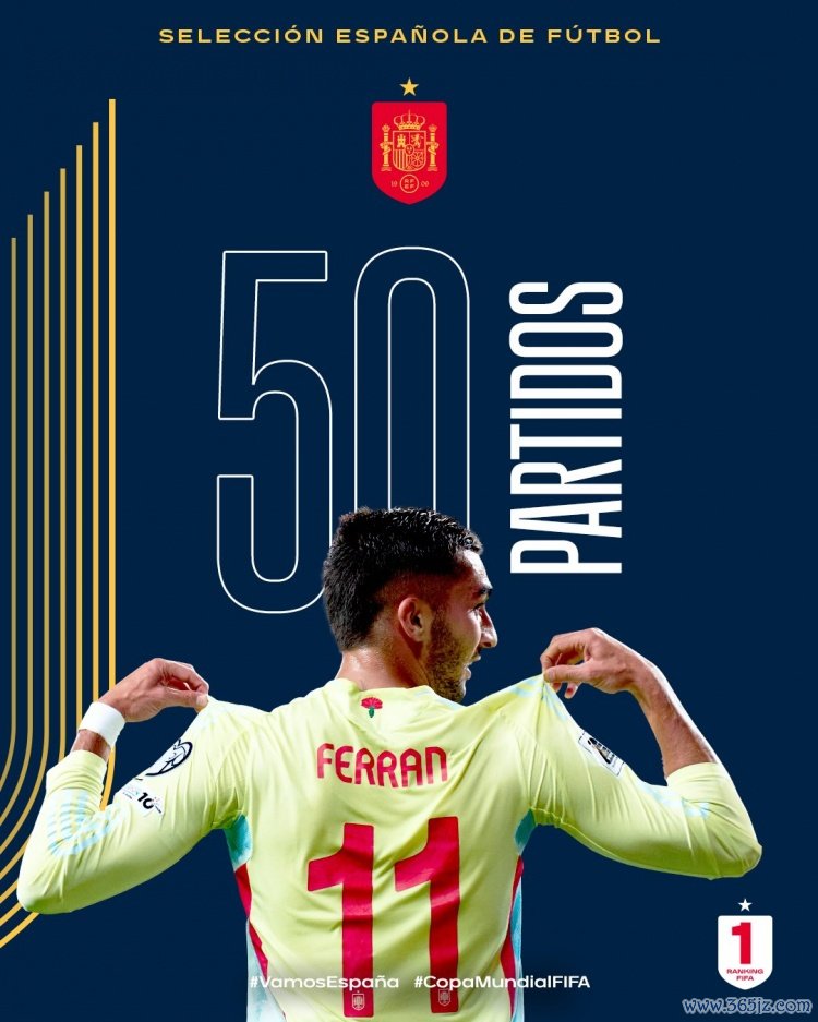 西班牙足协官方晒出了费兰-托雷斯50场比赛的海报,并配文写谈:“为国度队出战50场,祝愿费兰-托雷斯!”