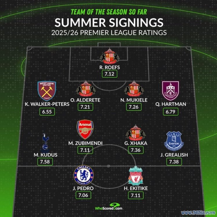 10月14日讯 英超7轮战罢,WhoScored评出了由今夏新援构成的最好11东说念主威望,四名桑德兰球员入选(数据为联赛数据)。