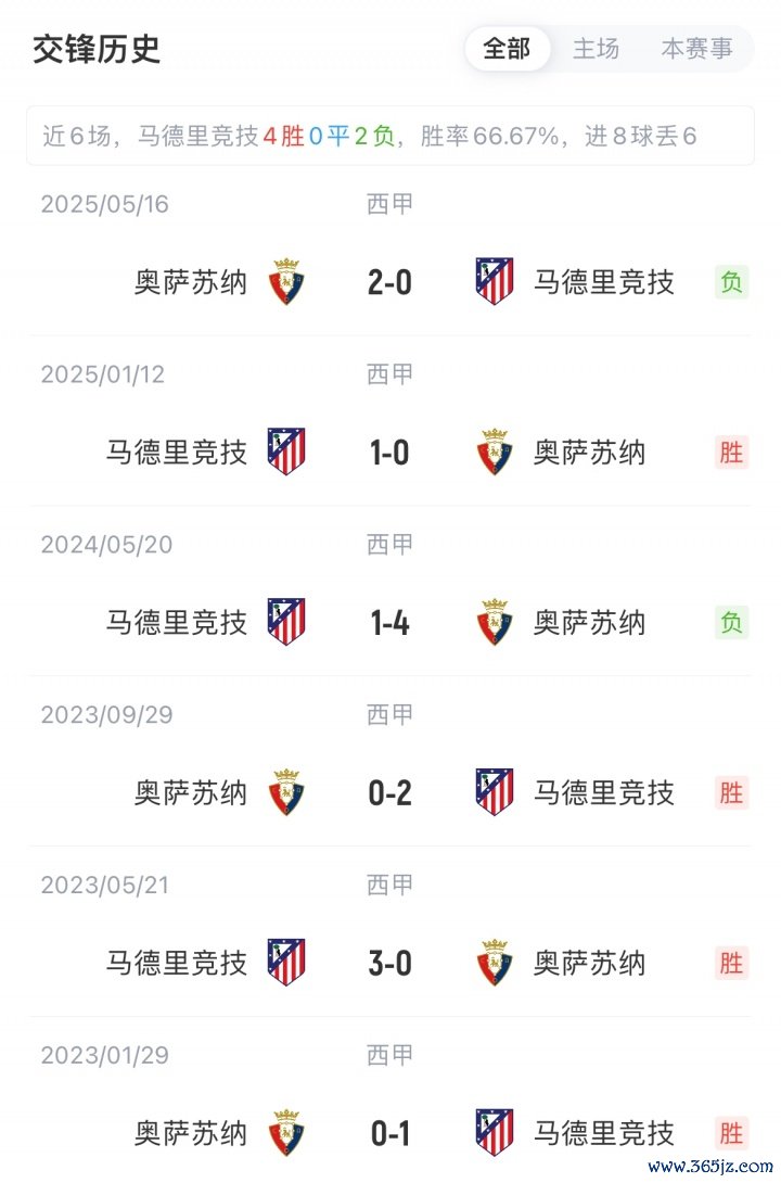 马竞联赛3胜4平1负积13分,主场各赛事已成绩4连胜;奥萨苏纳联赛3胜1平4负积10分,客场遇到4连败。两边上一次交锋马竞客场0-2不敌奥萨苏纳。
