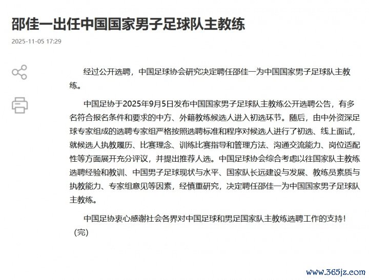 经由公开选聘,中国足球协会连系决定聘请邵佳一为中国国度男人足球队主说明。
