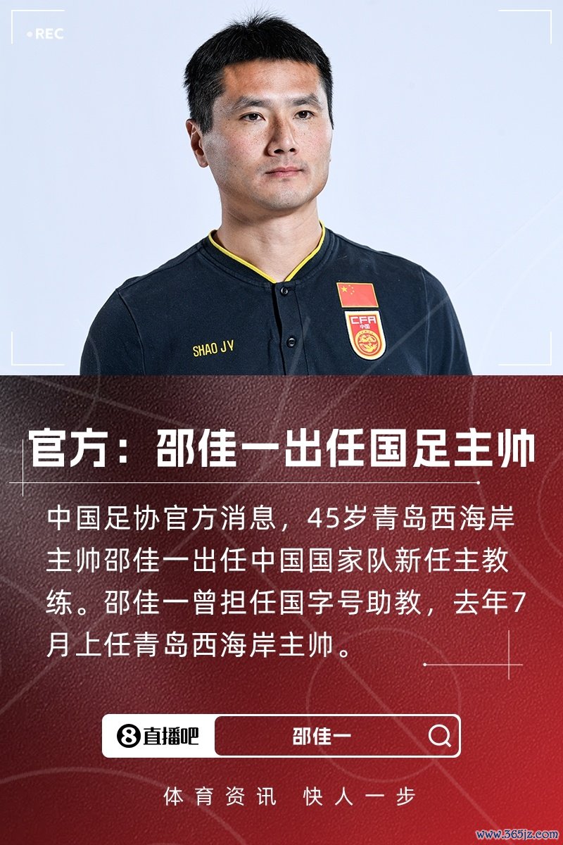 11月05日讯 中国足协官方音讯,45岁青岛西海岸主帅邵佳一出任中国国度队新任主帅。