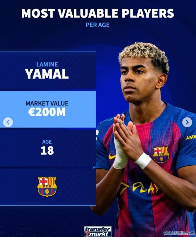 11月9日讯 《转会市集》统计了16岁到25岁的各年级最高身价情况,18岁亚马尔2亿欧居首。