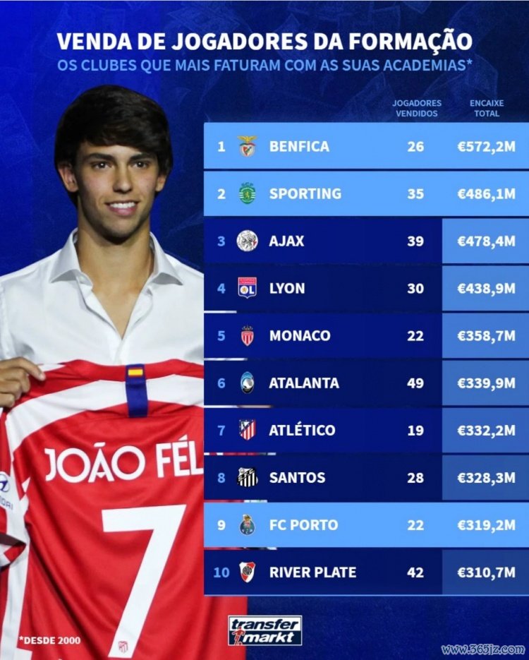 11月21日讯 德国转会市集统计了本世纪各俱乐部出售青训球员的收入,比肩出榜单,本菲卡、葡萄牙体育、阿贾克斯前三。
