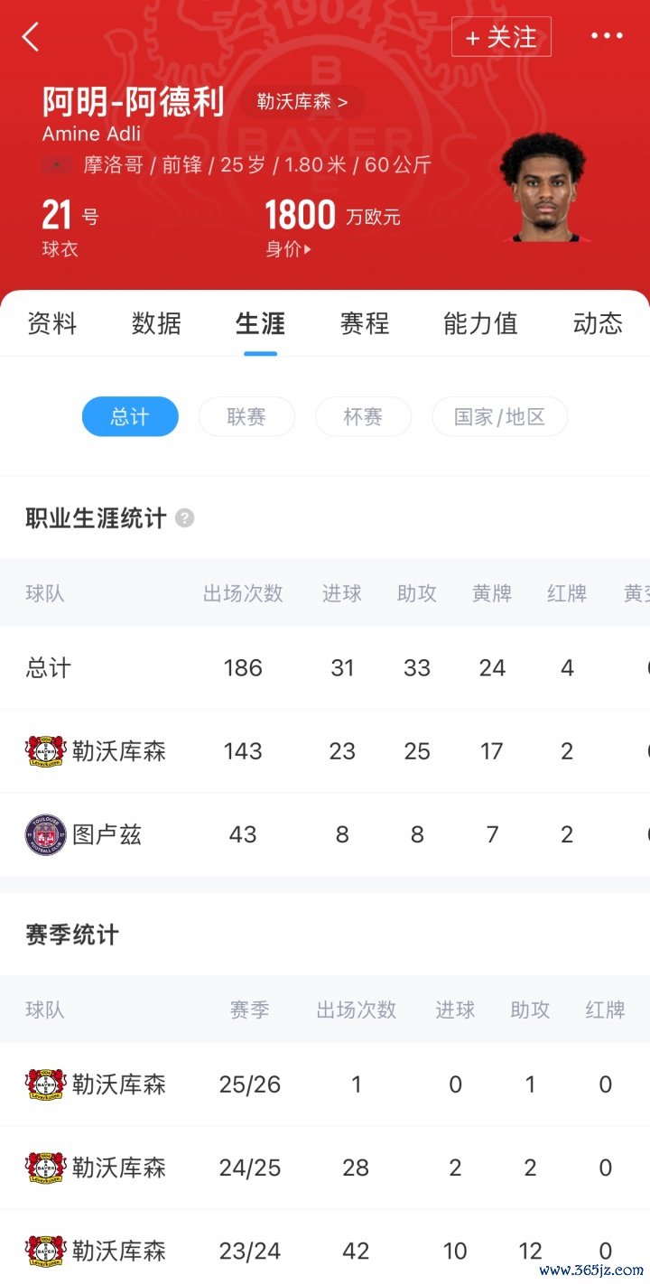 阿明-阿德利时年25岁,摩洛哥籍时尚。上赛季他为药厂各项赛事出场28次,得回2粒进球和1次助攻,当今其德回身价为1800万欧。