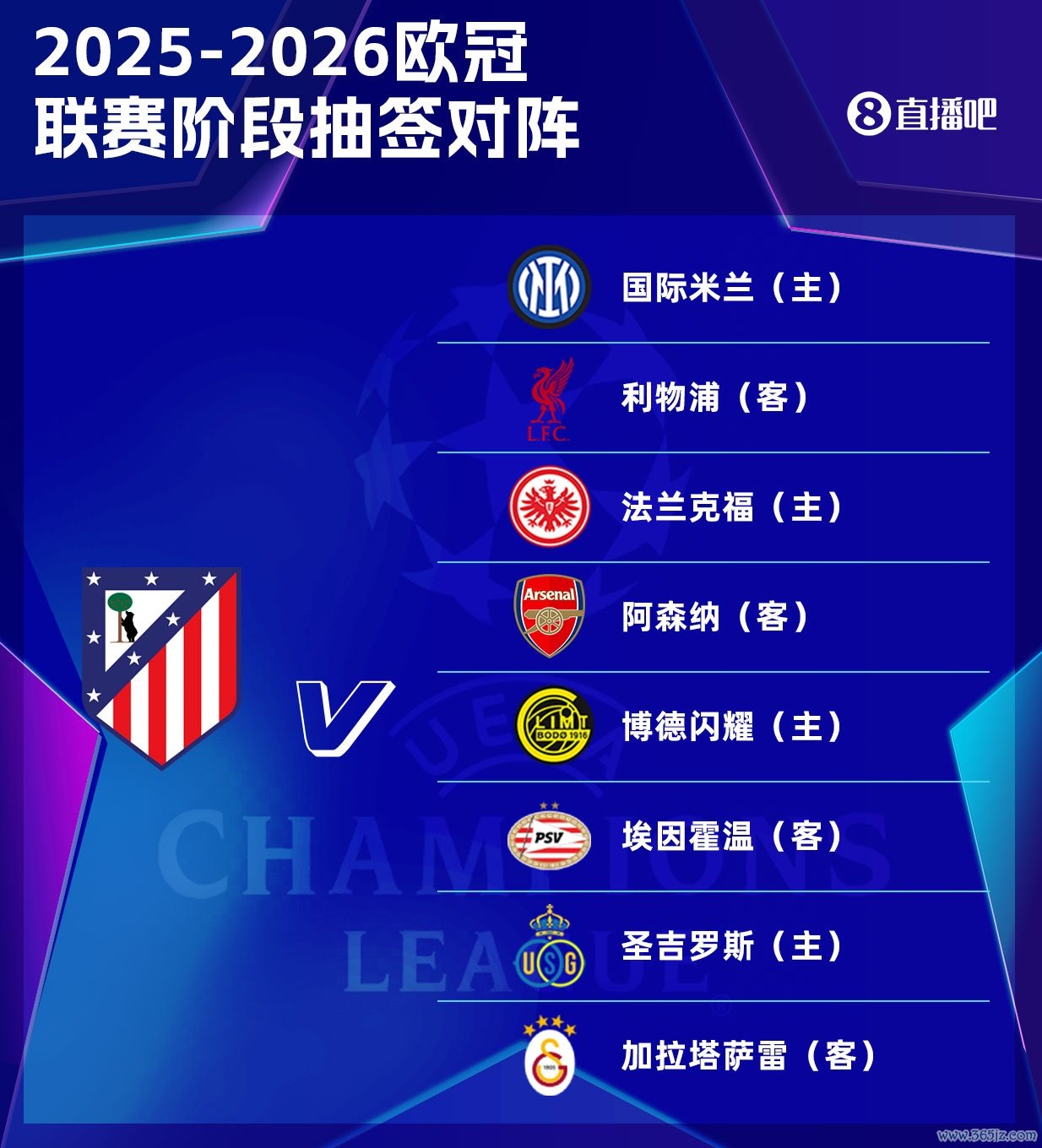 8月29日讯 25-26赛季欧冠联赛阶段抽签,马竞联赛阶段8支敌手出炉。
