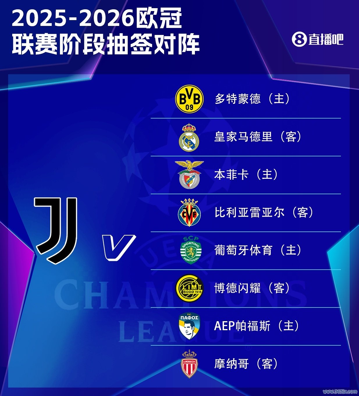 8月29日讯 25-26赛季欧冠联赛阶段抽签,尤文联赛阶段8支敌手出炉。