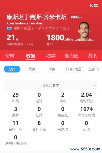 皆米卡斯现年29岁,上赛季为利物浦出场29场,现在身价1800万欧元。
