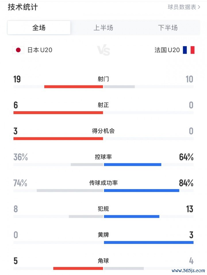 本场比赛旧例时辰,日本队狂轰19脚6次射正、控球率36%,法国10次射门0射正、控球率64%。
