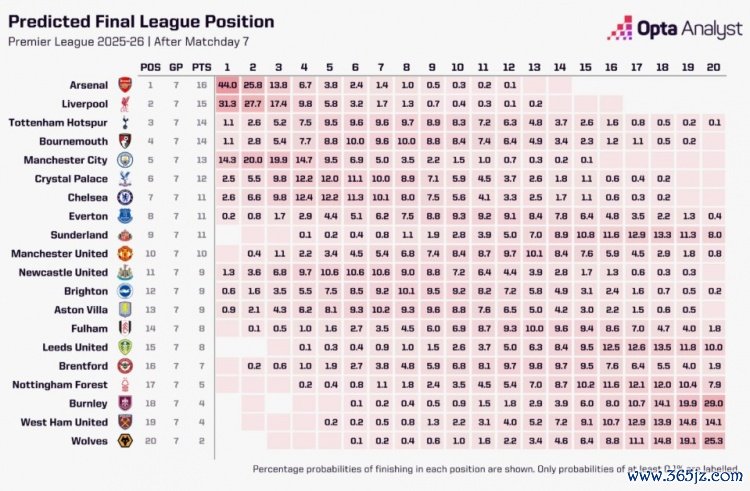 10月15日讯 英超七轮事后,数据机构OPTA超等议论机瞻望本赛季英超冠军↓