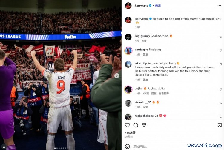 11月5日讯 拜仁在本轮欧冠焦点战2-1力克巴黎,凯恩在赛后通过社媒庆祝奏凯。