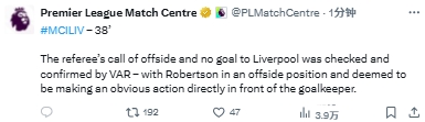 11月10日讯 英超第11轮曼城vs利物浦第38分钟范戴克头球破门,但因罗伯逊越位位置侵略门将进球被吹。英超官方解说进球无效原因。