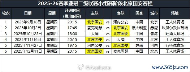 > 2025-26赛季亚冠二级联赛小组赛阶段北京国安赛程公布