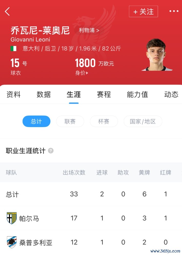 莱奥尼现年18岁,身高1米96司职中卫,球员现在德转估值1800万欧。