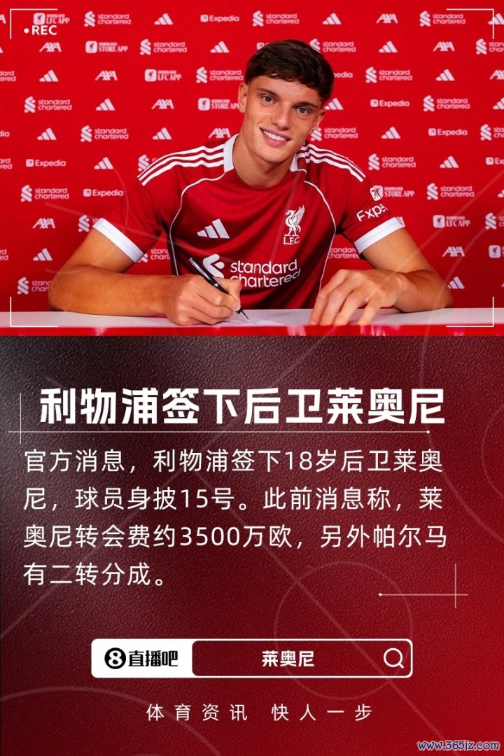 08月16日讯 官方音信,利物浦签下莱奥尼,两边签下一份永恒左券,球员将身披15号。来回还需球员取得海外许可和劳工证。
