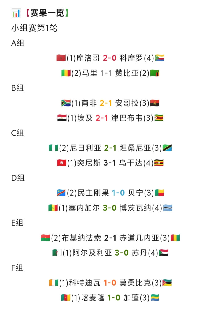 在首轮比赛中,几支传统强队摩洛哥、南非、埃及、突尼斯、尼日利亚、塞内加尔、科特迪瓦和喀麦隆王人得回了开门红,至少在首轮比赛中,本届非洲杯的第一场冷门还并莫得到来,但几支传统见解上的弱旅津巴布韦、坦桑尼亚和莫桑比克王人让敌手感受到了压力。本轮最具戏剧性的比赛发生在布基纳法索和赤说念几内亚之间,而马里和赞比亚孝顺了本轮惟一的一场平局。