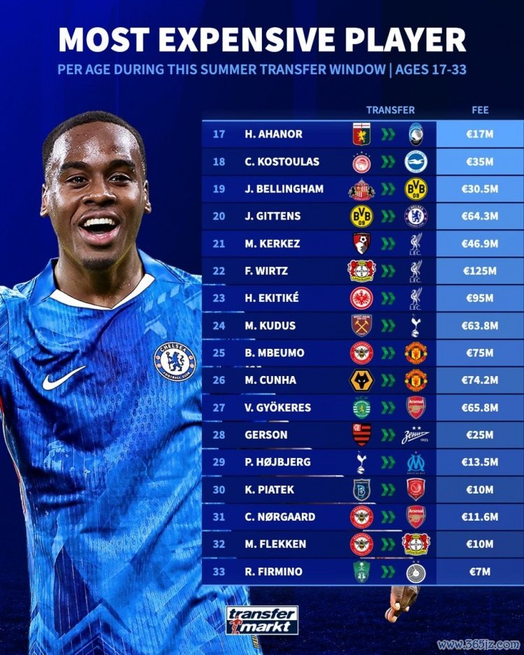 7月28日讯 今夏各大联赛重磅引援收敛,《转会市集》也列出了从17岁到33岁的各年齿“标王”。