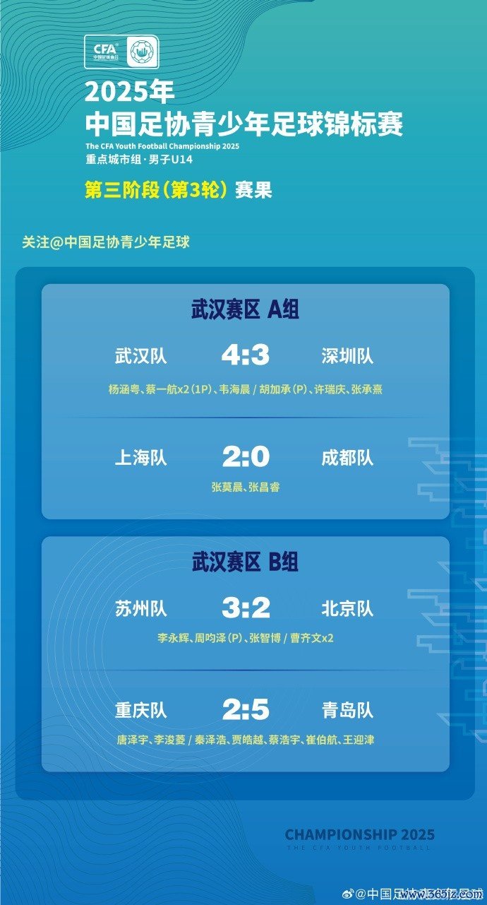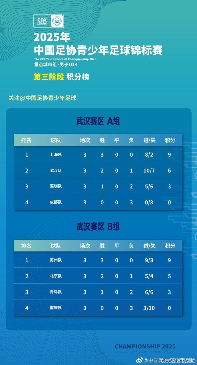 2025年中国足协青少年足球锦标赛要点城市男人U14组第三阶段第3轮赛果+积分榜 🎙️