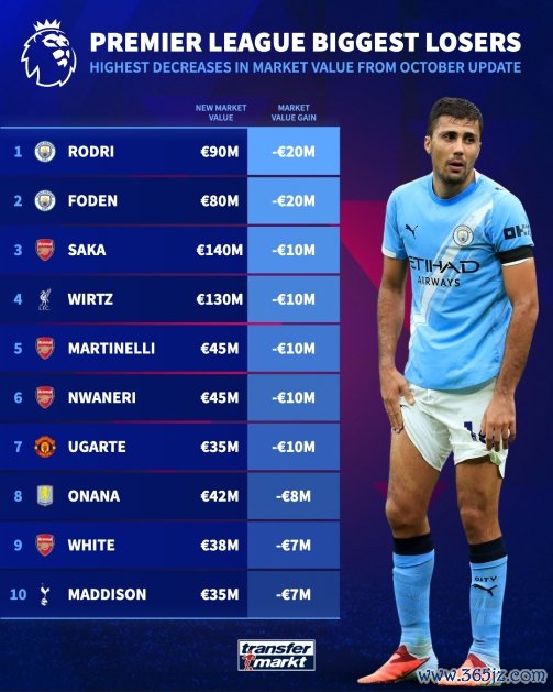 10月17日讯 德转更新英超身价,其中跌的最多的是罗德里和福登,他们身价皆着落了2000万欧。