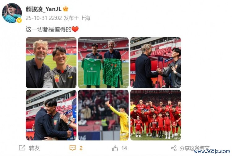 赛后,海港门将颜骏凌晒出了与偶像范德萨的合照,并写说念:这一切皆是值得的。