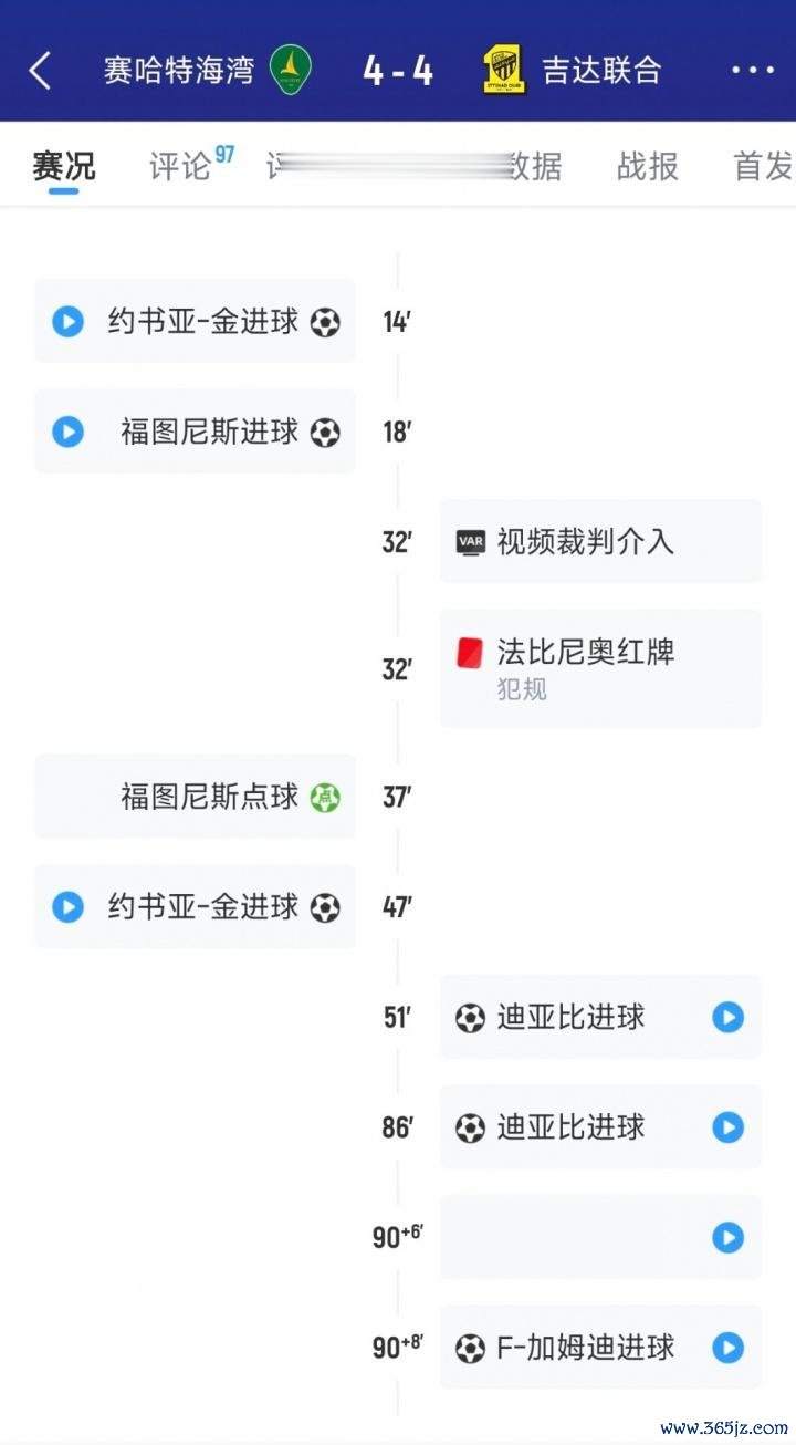 前英超名将迪亚比第51分钟为吉达聚积吹起反击的军号,10东谈主应战的吉达聚积在第86分钟、90+6分钟,90+8分钟连进3球,将比分打平成4-4,完成了惊天的绝平。