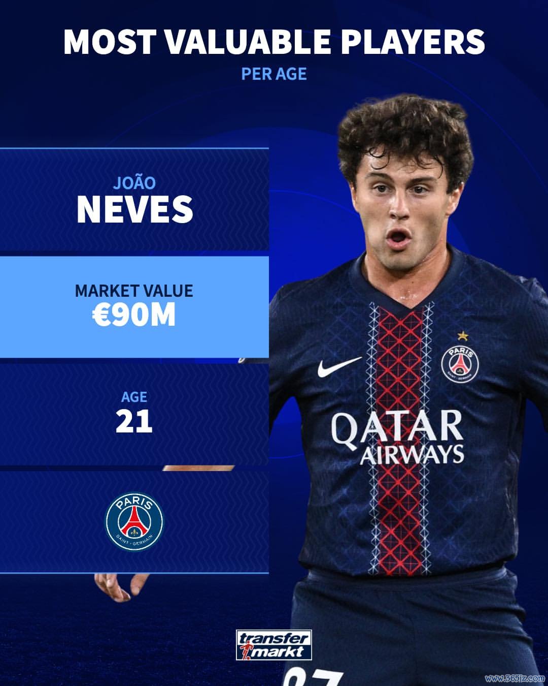 6.若昂-内维斯,21岁,巴黎圣日耳曼,身价9000万欧元