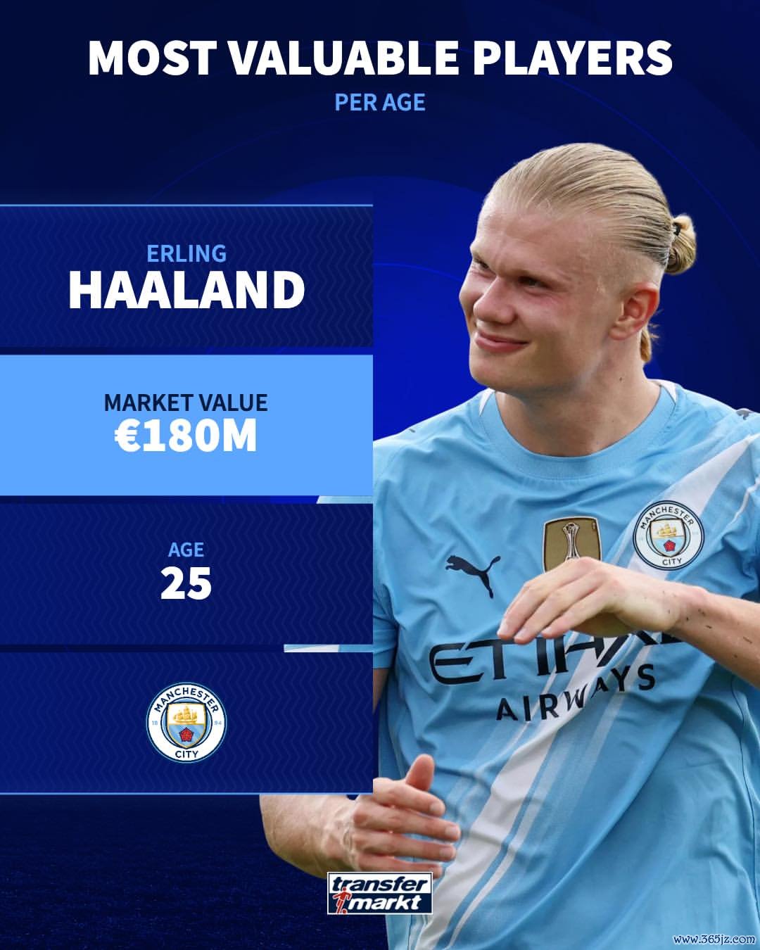 10.哈兰德,25岁,曼城,身价1.8亿欧元