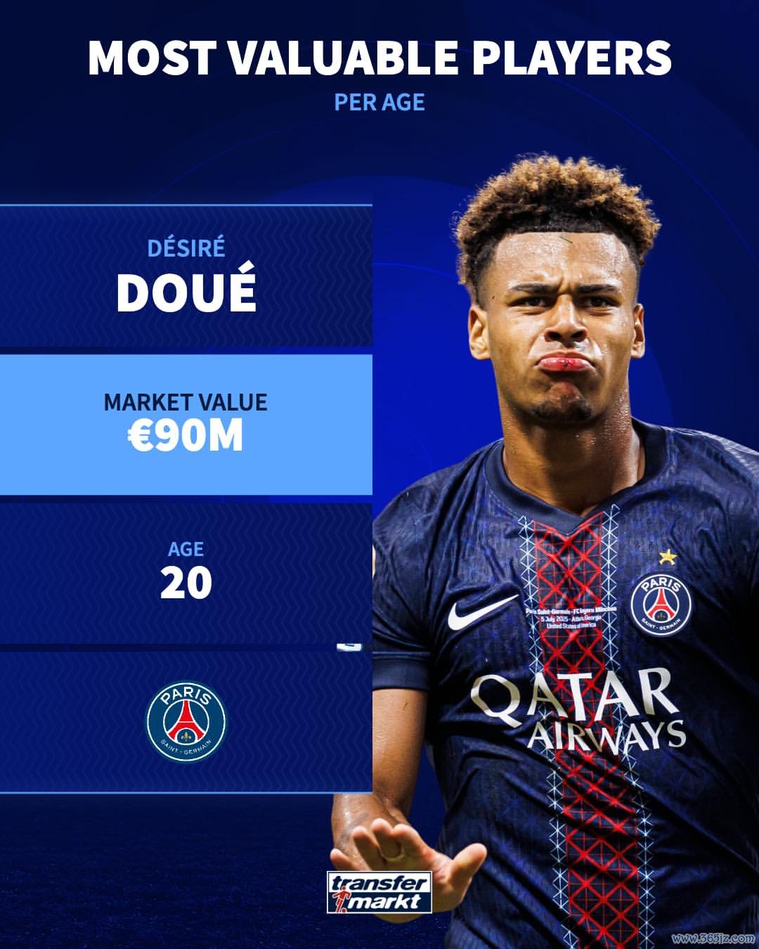 5.杜埃,20岁,巴黎圣日耳曼,身价9000万欧元