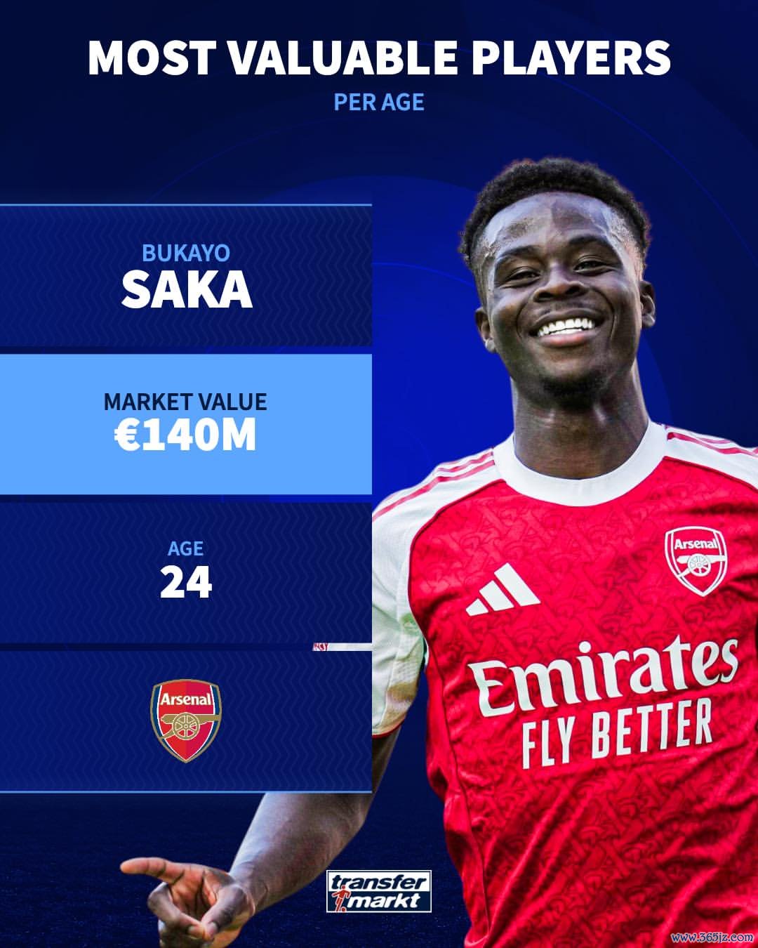 9.萨卡,24岁,阿森纳,身价1.4亿欧元