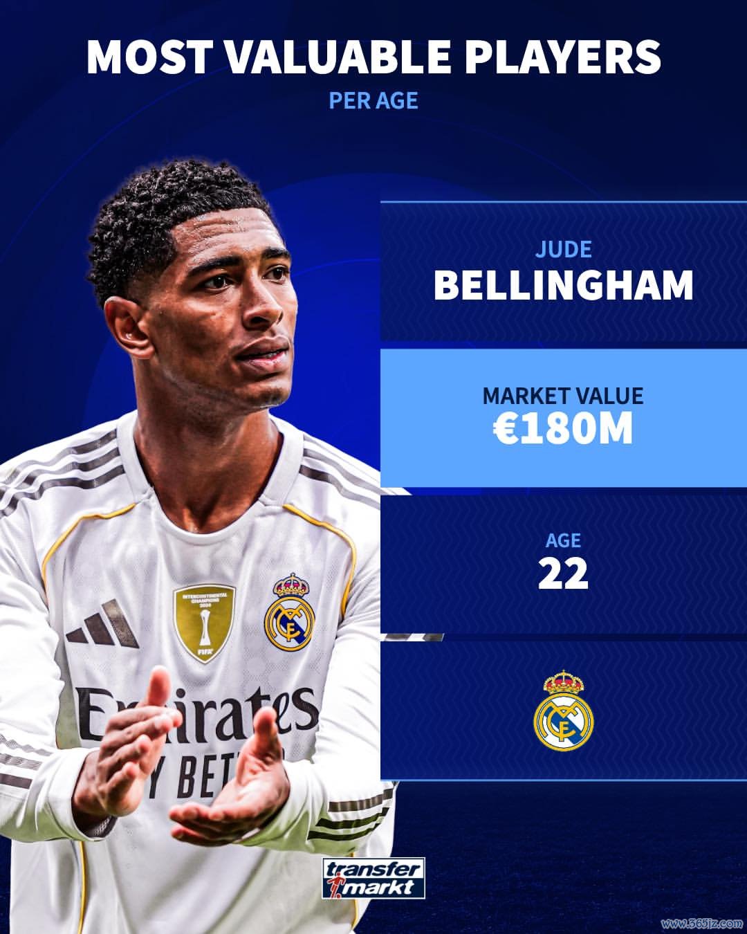 7.贝林厄姆,22岁,皇家马德里,身价1.8亿欧元