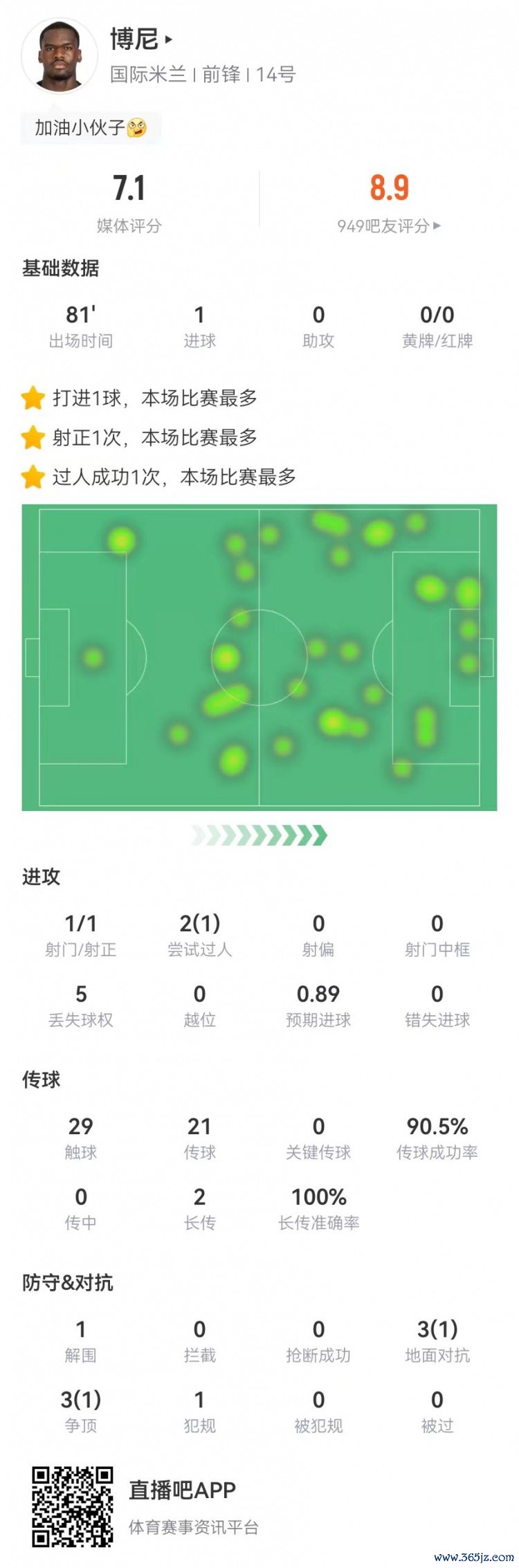 11月10日讯 本轮意甲焦点战国米2-0力克拉都奥,博尼本场数据如下: