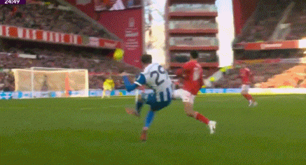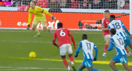 伤停补时7分钟。全场比赛截止,诺丁汉丛林0-2布莱顿。