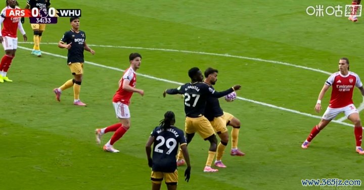 10月04日讯 英超第7轮,阿森纳vs西汉姆联。比赛第33分钟,西汉姆联球员马加萨禁区内用手触球,主裁判未暗意,VAR莫得介入。