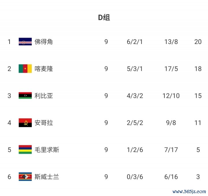 世初赛非洲区D组现在积分榜↓