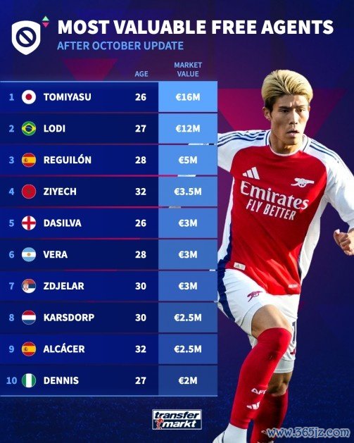 10月21日讯 德转更新目田球员身价名次榜,富安健洋1600万欧居首,雷吉隆、都耶赫、帕科位居前十位。