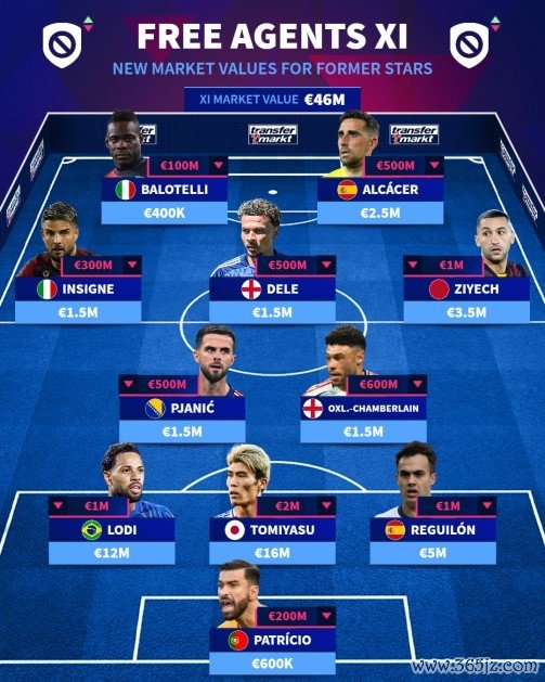 中场:皮亚尼奇150万欧、张伯伦150万欧、因西涅150万欧、阿里150万欧、都耶赫350万欧