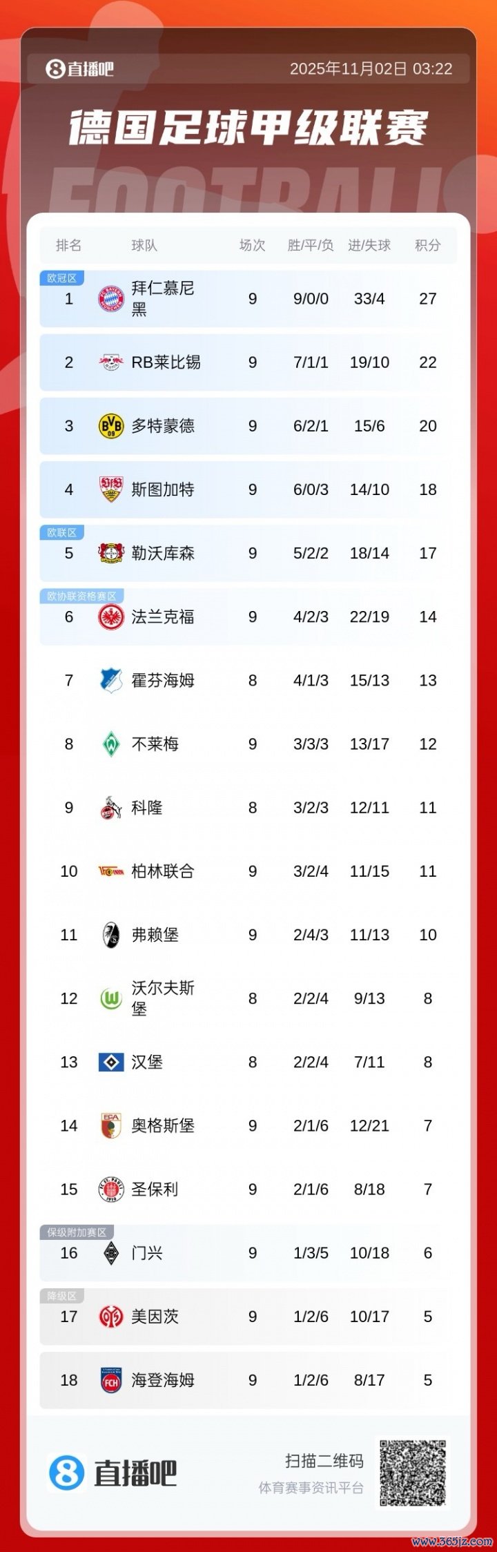 11月02日讯 德甲第9轮,拜仁3-0大捷勒沃库森,德甲豪取9连胜,狂轰33球。