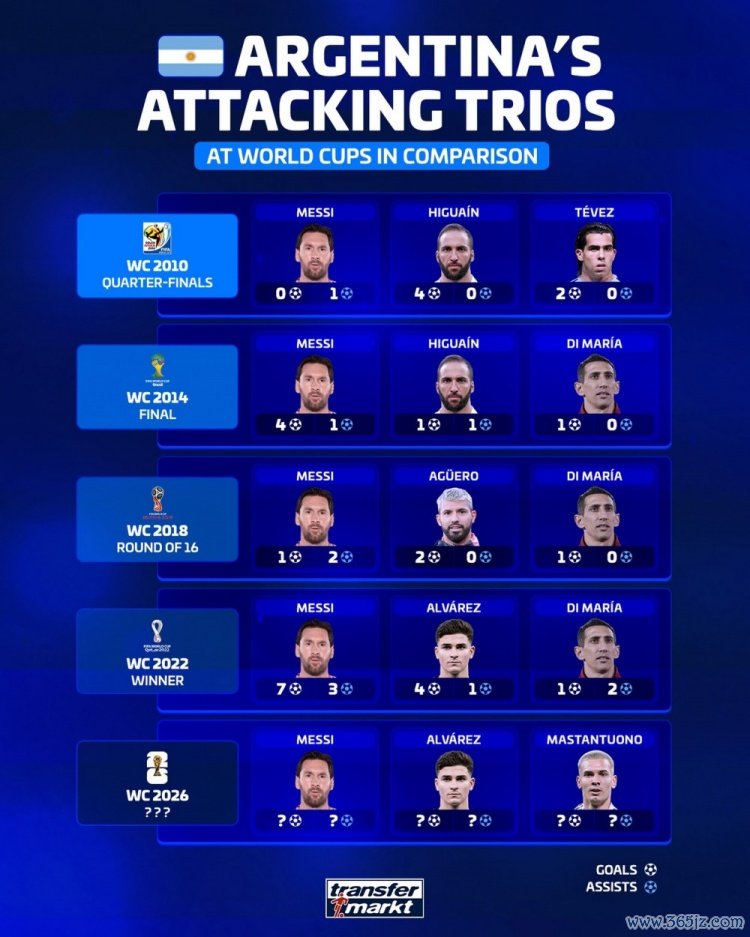 11月19日讯 德国转会市集列出了阿根廷队近5届寰宇杯的锋线三叉戟,并展望来岁寰宇杯梅西、阿尔瓦雷斯、马斯坦托诺在锋线搭档。