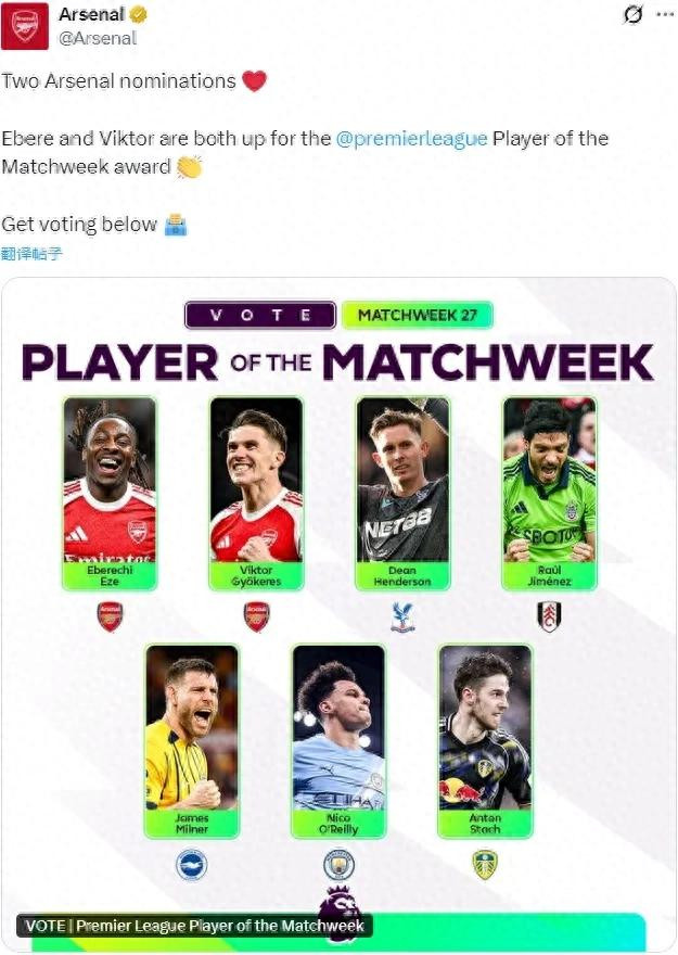官方:埃泽和哲凯赖什都被提名为了英超上周最佳运动员候选。