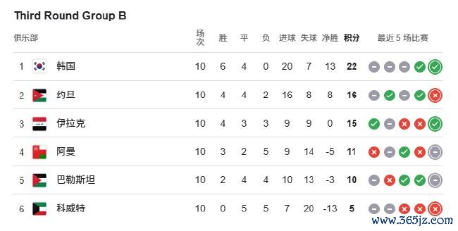 B组的韩国和约旦相通是提前晋级天下杯决赛圈,伊拉克在终末一场比赛中打败了约旦,最终排行小组第3,获取了附加赛经验。而阿曼通过点球绝平巴勒斯坦,拿下B组终末一个附加赛席位。巴勒斯坦错失好局,同科威特一都被淘汰出局。