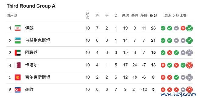 3个小组当中,A组的悬念开端闭幕,第9轮比赛事后就已尘埃落定。最终伊朗23分、乌兹别克斯坦21分,两队联袂晋级天下杯决赛圈,阿联酋15分、卡塔尔13分需参加下阶段的附加赛,吉尔吉斯斯坦、朝鲜被淘汰。