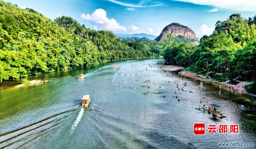 新宁县崀山得志崴蕤。夫夷江上游筏穿梭,游东谈主如织,自然浑成一幅画卷。颜克明 摄