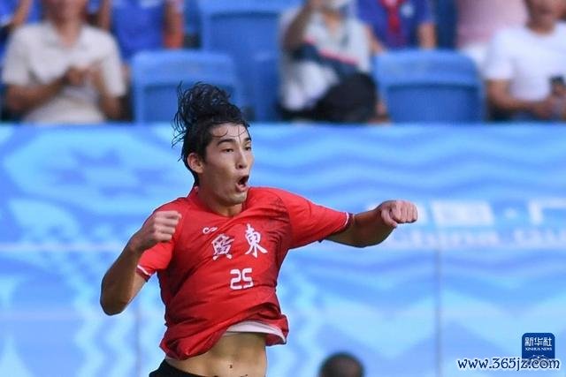 10月14日,广东队球员魏祥鑫在比赛中庆祝进球。新华社记者 毛念念倩 摄