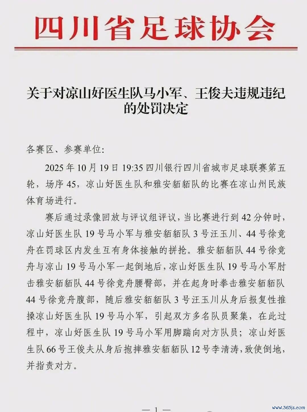 四川省足球协会对于对凉山好医师队马小军、王俊夫违规违规的处罚决定