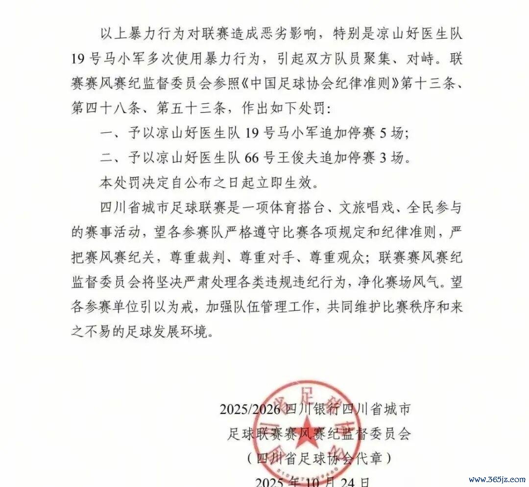 一、给予凉山好医师队19号马小军追加停赛5场;