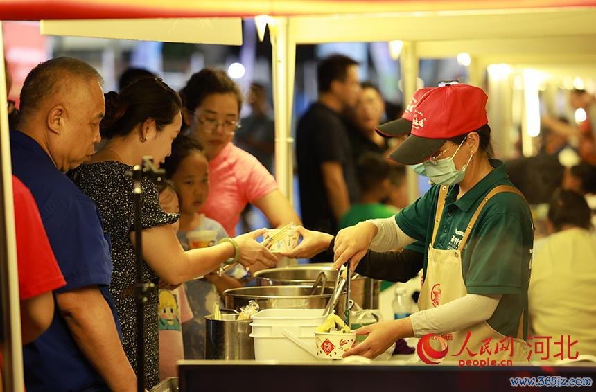 石家庄赛场外“足球商场”,联翩而至的不雅众列队品味石家庄特点好意思食。人民网记者 李兆民摄