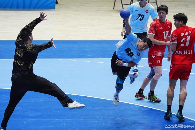 11月8日,香港队球员刘健斌(左二)在比赛中紧迫。 当日,在香港进行的第十五届宇宙教唆会须眉手球半决赛中,安徽队24比21慑服香港队。 新华社记者 朱炜 摄